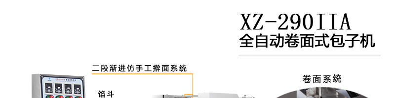 XZ-290IIA包子機,可生產各種不同餡料的包子、各式包餡食品,如豆沙包、南瓜餅、肉包、小籠包、水晶包等幾十種包餡制品。適用于個體戶、食品廠、學校等單位食堂??蓾M足不同客戶群體。免費提供工藝技術。