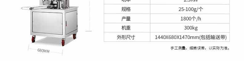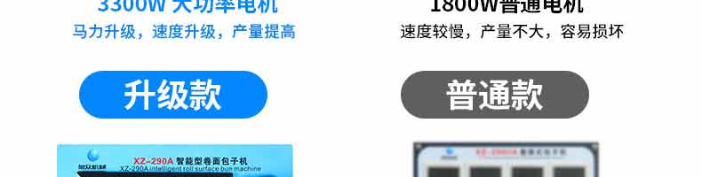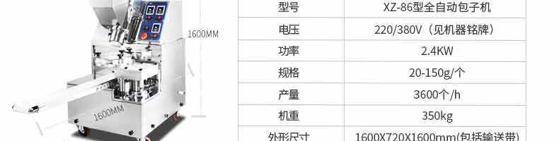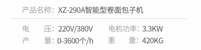 名稱XZ-290A智能型卷面包子機(jī) 電源 功率3.3KW 產(chǎn)量0-3600個(gè)/h 尺寸2680*1500*1420mm(包括輸送帶) 重量420KG 規(guī)格 其他