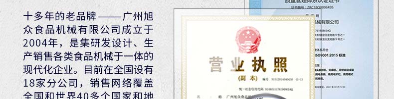廣州旭眾食品機械有限公司是一家集科研開發(fā),生產(chǎn)設(shè)計,營銷服務(wù)為一體的現(xiàn)代化生產(chǎn)企業(yè)。現(xiàn)代化生產(chǎn)車間,精湛制造技術(shù),所產(chǎn)機械歷經(jīng)市場重重考驗,不斷贏得海內(nèi)外客戶的贊譽。