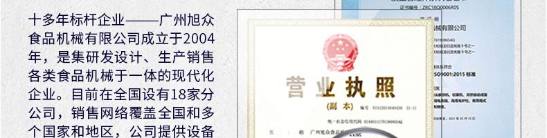 廣州旭眾食品機(jī)械有限公司是一家集科研開發(fā),生產(chǎn)設(shè)計(jì),營銷服務(wù)為一體的現(xiàn)代化生產(chǎn)企業(yè)?,F(xiàn)代化生產(chǎn)車間,精湛制造技術(shù),所產(chǎn)機(jī)械歷經(jīng)市場重重考驗(yàn),不斷贏得海內(nèi)外客戶的贊譽(yù)。
