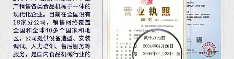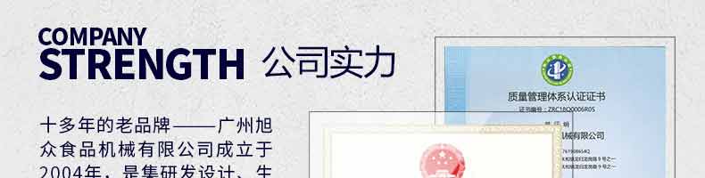 廣州旭眾食品機械有限公司是一家集科研開發(fā),生產(chǎn)設計,營銷服務為一體的現(xiàn)代化生產(chǎn)企業(yè)?,F(xiàn)代化生產(chǎn)車間,精湛制造技術,所產(chǎn)機械歷經(jīng)市場重重考驗,不斷贏得海內外客戶的贊譽。