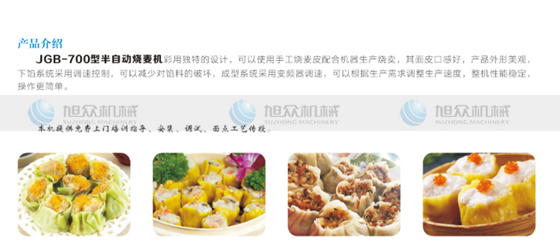 JGB-700燒麥機,采用特的設(shè)計,可以使用手工燒麥皮配合機器生產(chǎn)燒賣,其面皮口感好,產(chǎn)品外形美觀下餡系統(tǒng)采用調(diào)速控制,可以減少對餡料的破壞,成型系統(tǒng)呆用變頻器調(diào)速,可以根據(jù)生產(chǎn)需求調(diào)整生產(chǎn)速度,整機性能穩(wěn)定操作更簡單