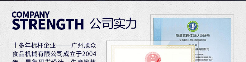 廣州旭眾食品機(jī)械有限公司是一家集科研開發(fā),生產(chǎn)設(shè)計(jì),營(yíng)銷服務(wù)為一體的現(xiàn)代化生產(chǎn)企業(yè)?,F(xiàn)代化生產(chǎn)車間,精湛制造技術(shù),所產(chǎn)機(jī)械歷經(jīng)市場(chǎng)重重考驗(yàn),不斷贏得海內(nèi)外客戶的贊譽(yù)。