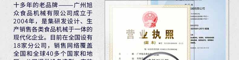 廣州旭眾食品機(jī)械有限公司是一家集科研開(kāi)發(fā),生產(chǎn)設(shè)計(jì),營(yíng)銷服務(wù)為一體的現(xiàn)代化生產(chǎn)企業(yè)?,F(xiàn)代化生產(chǎn)車間,精湛制造技術(shù),所產(chǎn)機(jī)械歷經(jīng)市場(chǎng)重重考驗(yàn),不斷贏得海內(nèi)外客戶的贊譽(yù)。