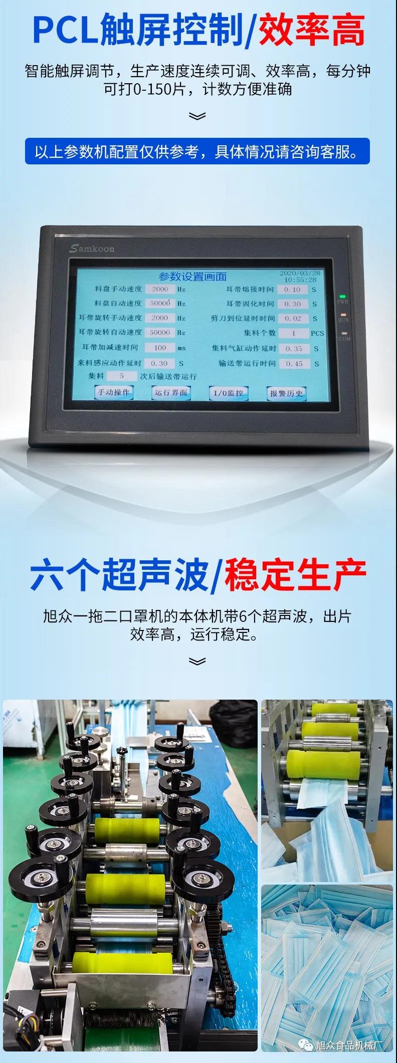 旭眾牌一拖二口罩機由一臺本體機帶動兩臺耳帶機組成。本體機輸出ロ罩本體后,由輸送帶結(jié)構(gòu)將口罩本體片輸送到連接耳帶機的輸送帶上,再通過輸送帶將口罩片輸送到耳帶機的正面第一個口罩盤上方,最后通過氣缸下壓把口罩片放置到耳帶機的口罩盤內(nèi),后續(xù)由耳帶機完成口罩的耳帶熔接,包邊等動作,從而完成一個耳帶口罩產(chǎn)品的生產(chǎn)。本機采用PLC、觸摸屏控制、主傳送帶采用單相馬達(dá)輸送、步進馬達(dá)翻轉(zhuǎn),傳動精確,控制穩(wěn)定,速度可調(diào)。